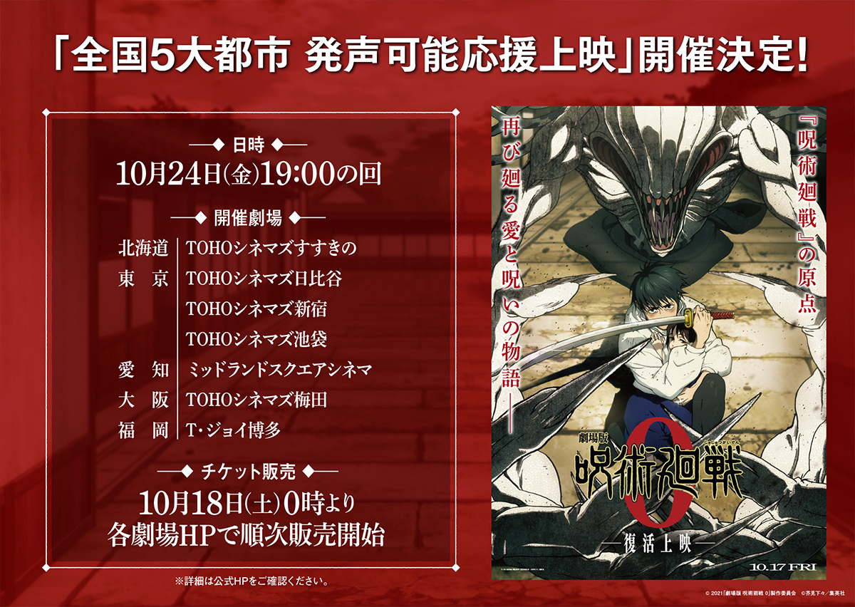この度、『劇場版 呪術廻戦 0』復活上映を皆様により楽しんでいただくため、「全国5大都市 発生可能応援上映」を開催させていただく運びとなりました。